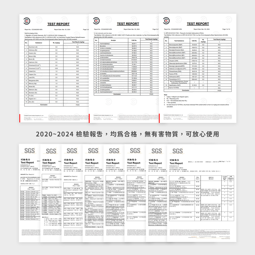 通過無多環芳香烴、無重金屬、無塑化劑、無偶氮色料等多項安全檢驗,讓使用者安心。