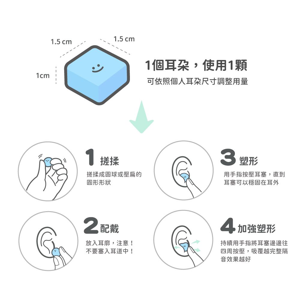 • 本產品由於軟性可塑質地,因此會類似黏土,如無法接受軟性材質配戴在耳朵裡,請斟酌購買